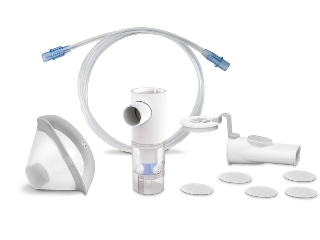 - set obsahuje: nádobku na liečivo (set rozprašovacej komory), masku pre dospelých, hadičku, náustok, filtre