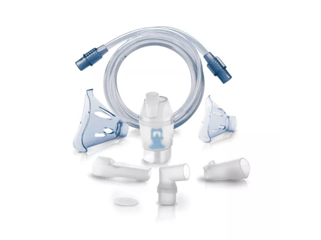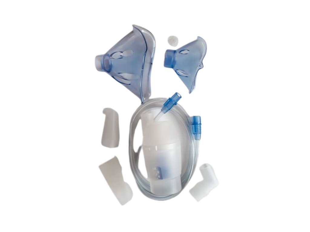 - Kompletný set - obsahuje: nádobku na liečivo (set rozprašovacej komory), masku pre dospelých, masku pre deti, inhalačnú hadičku 100 cm, náustok, adaptér na masku, nosný násadec, filter