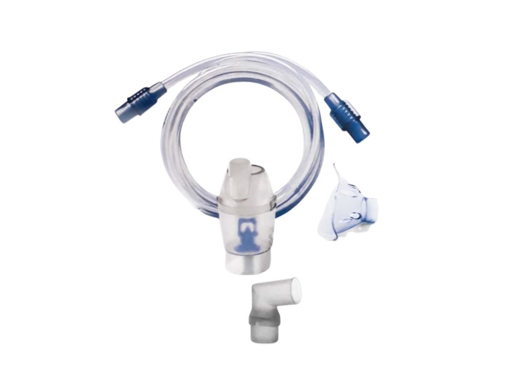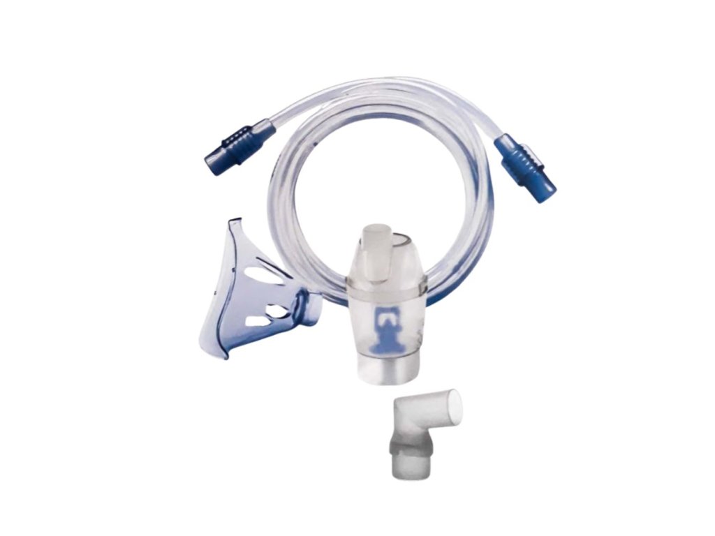 - Set príslušenstva pre dospelých - obsahuje: nádobku na liečivo (set rozprašovacej komory), masku pre dospelých, inhalačnú hadičku 100 cm, adaptér na masku