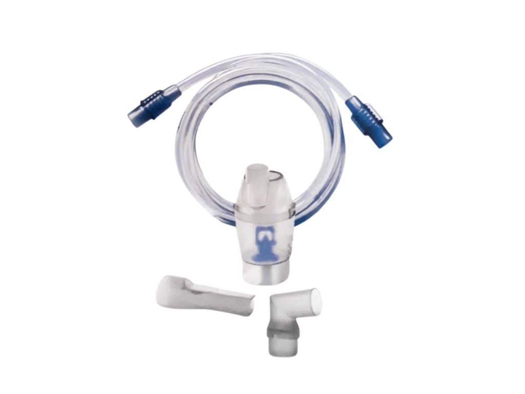 - Set príslušenstva s náustkom - obsahuje: nádobku na liečivo (set rozprašovacej komory), náustok, inhalačnú hadičku 100 cm, adaptér na masku