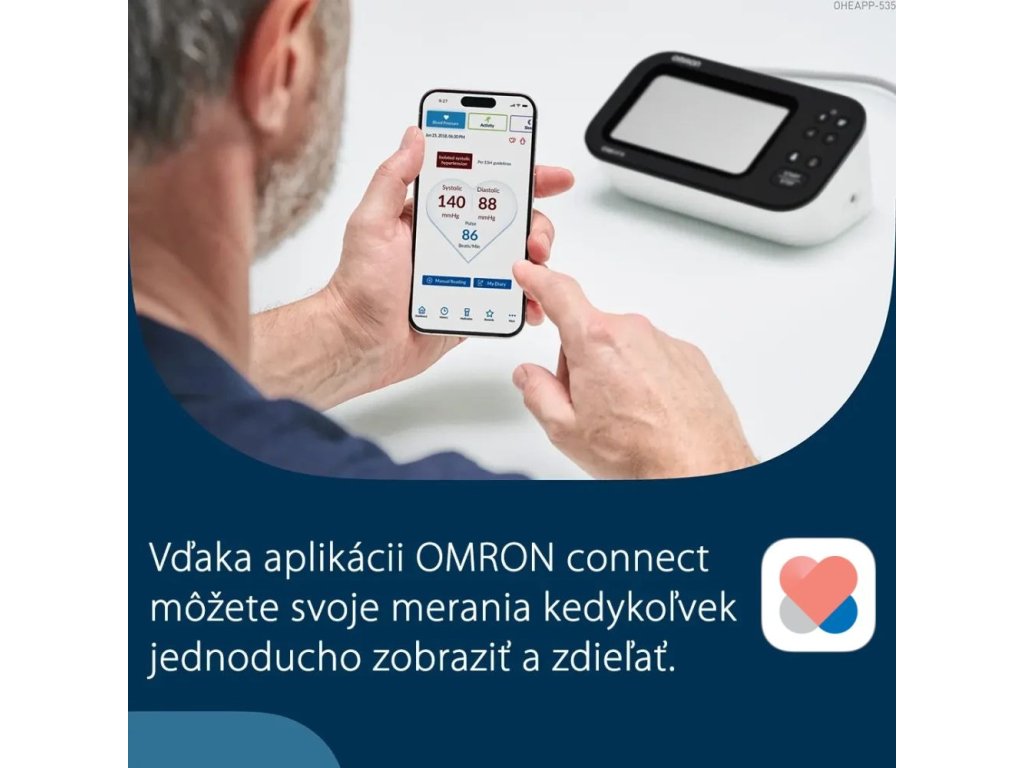 - bezdrôtové Bluetooth pripojenie k telefónu, alebo tabletu. Namerané dáta je možné odoslať do aplikácie OMRON connect, kde je ich možné nie len uchovávať, sledovať grafy histórie a priemery, ale aj zdieľať namerané výsledky s ďalšími aplikáciami (napr. Apple Health, Google Fit) či vašim lekárom. Aplikácia je zadarmo dostupná v češtine na GooglePlay a AppStore.